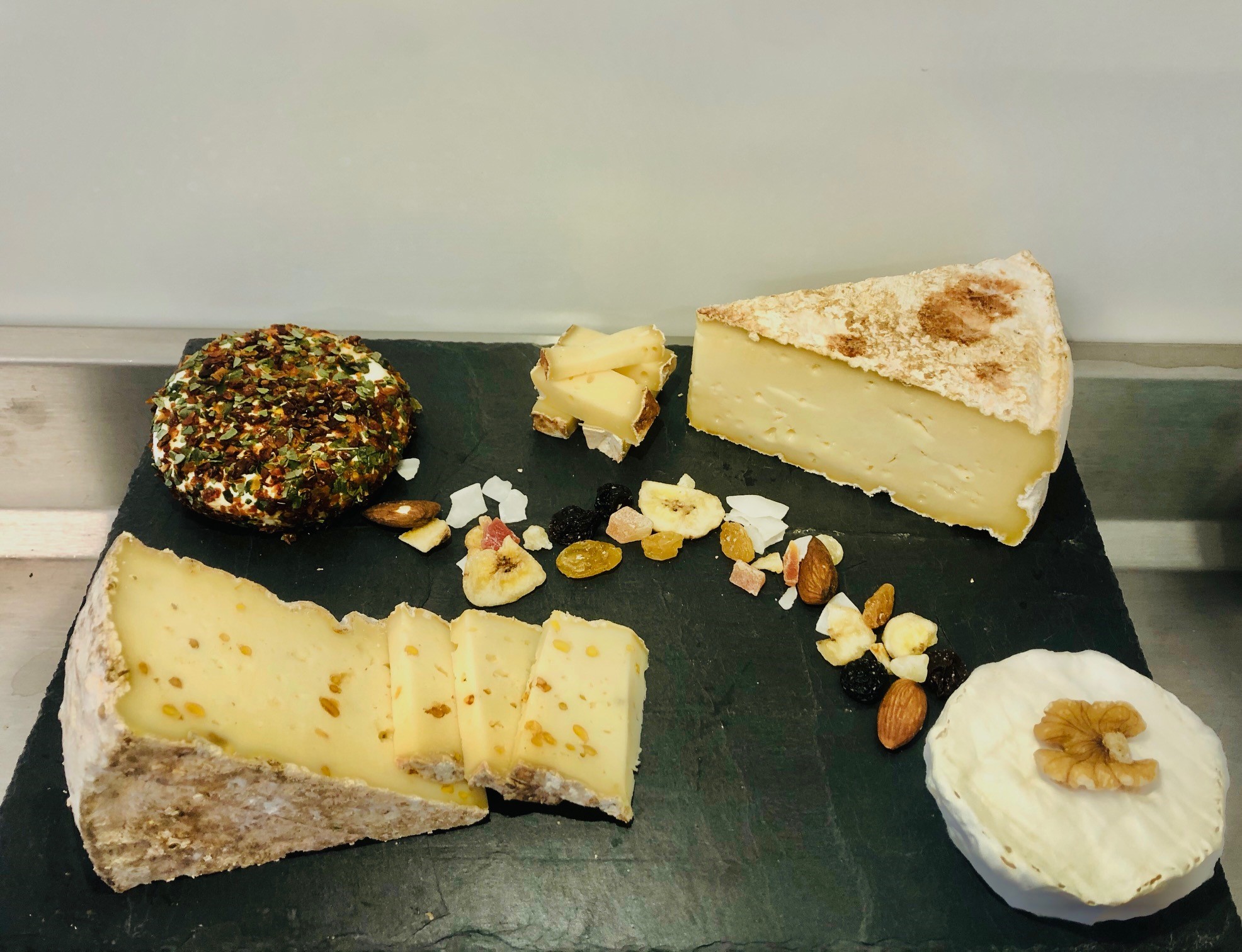 Dressé sur ardoise, vous retrouvez sur ce plateau un panachage de nos fromages (fromages frais, pâte molle, tommes…)