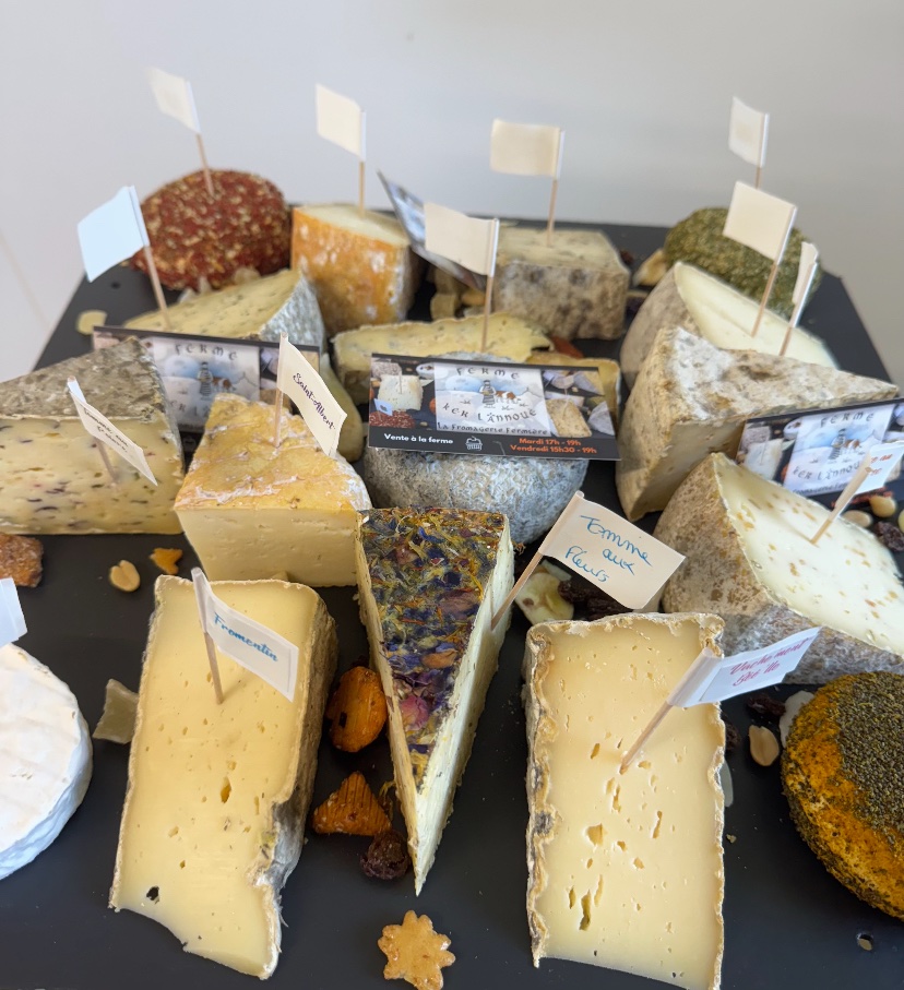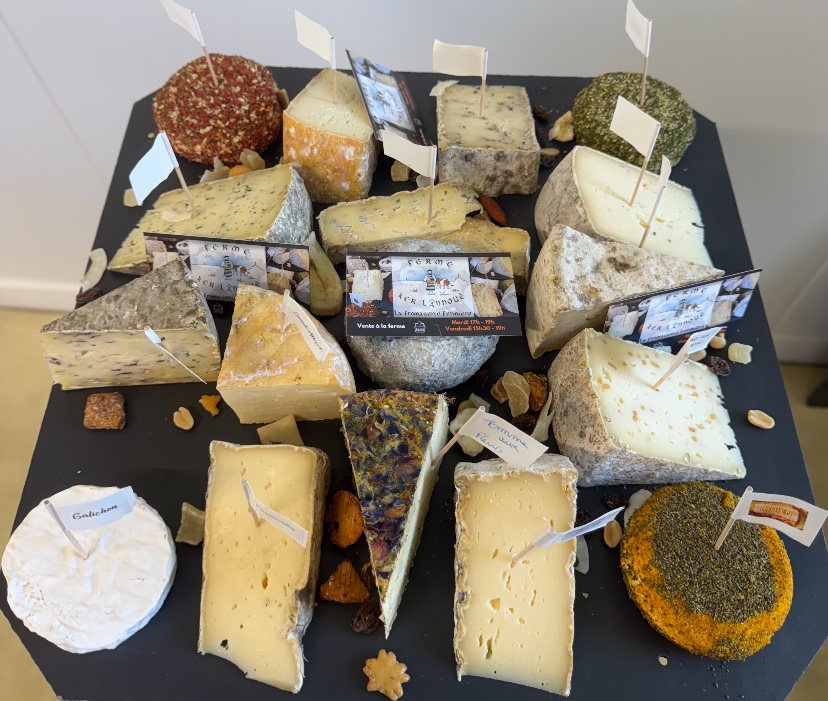 Dressé sur ardoise, vous retrouvez sur ce plateau un panachage de nos différents fromages (fromages frais, pâte molle, tommes… il est également complété avec une fromage de chèvre provenant de la chévrerie d’Eliss)